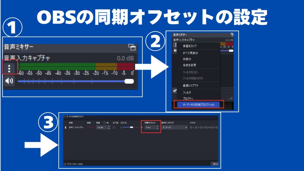 OBSの音声詳細プロパティで「100〜300ms」を目安に調整 - PC負荷を下げる