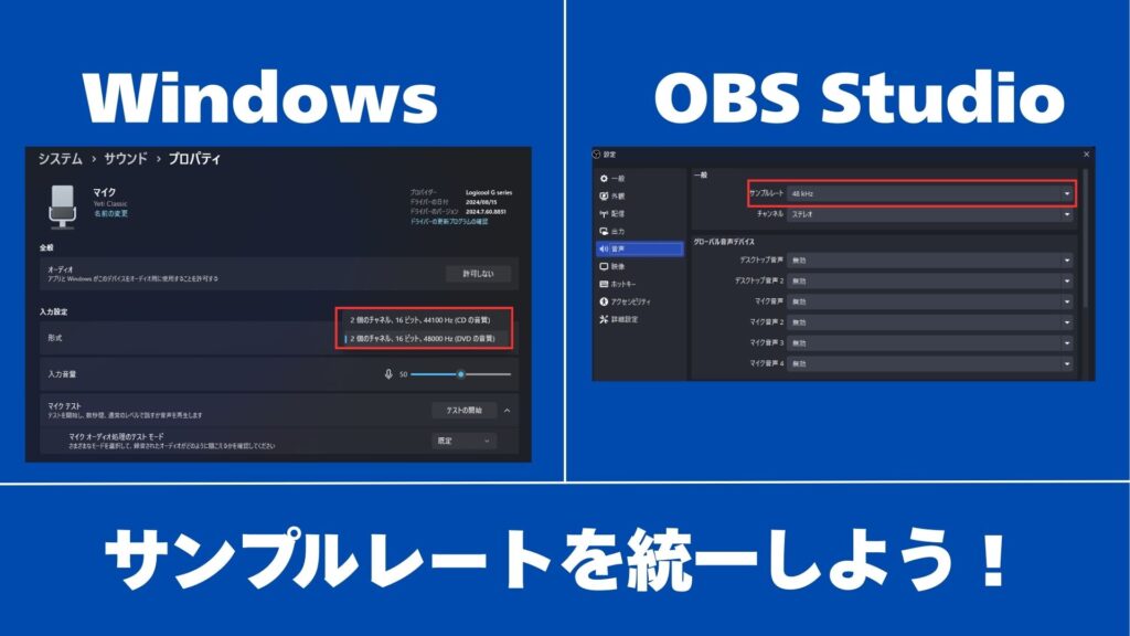 - OBSの「設定 → 音声」で同じ値(44.1kHzまたは48kHz)に揃える